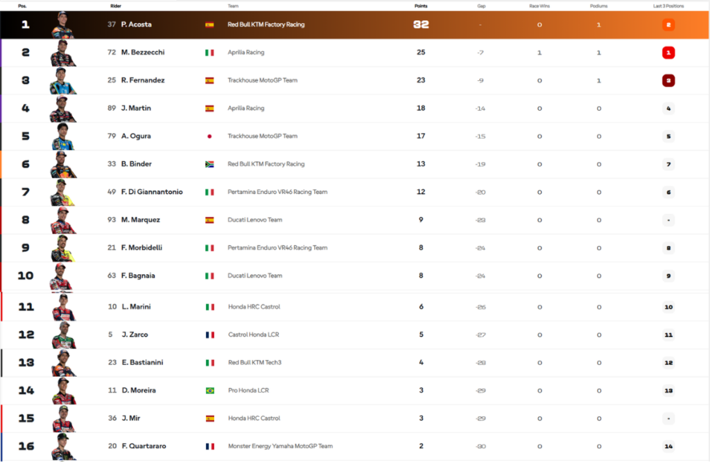 Sementara klasemen sementara MotoGP 2026 kini dipimpin Pedro Acosta dengan 32 poin. Marco Bezzecchi menempel di posisi kedua. Marquez? Terdampar di posisi kedelapan.